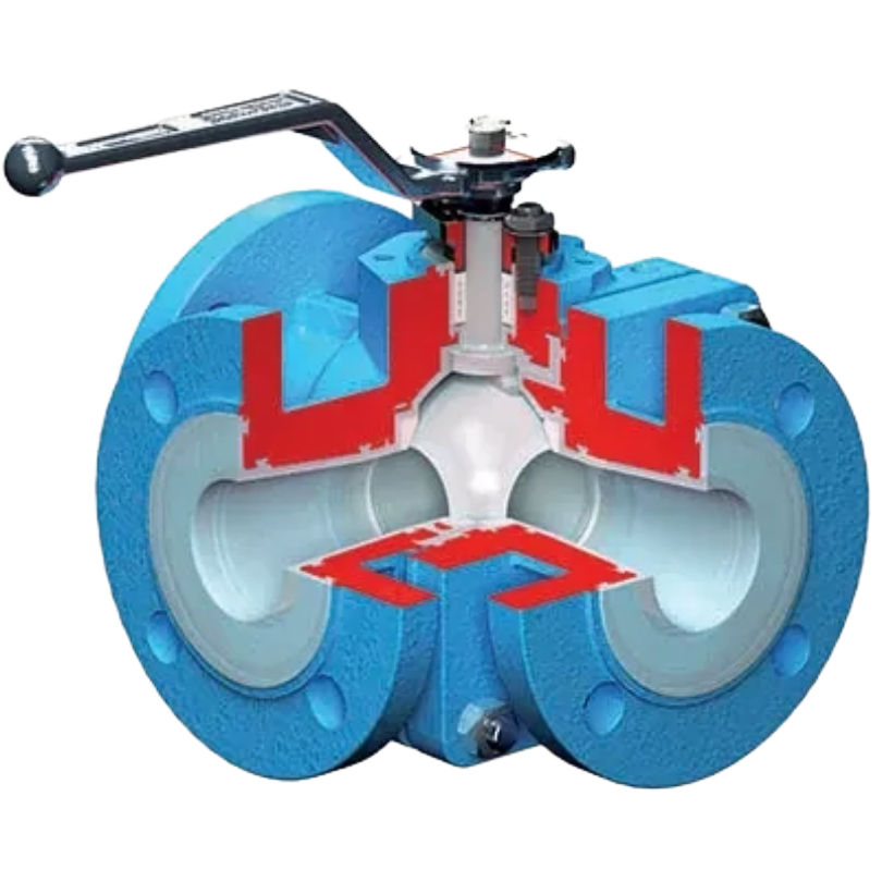A three-way fluoropolymer-lined ball valve designed for corrosive diverter service.